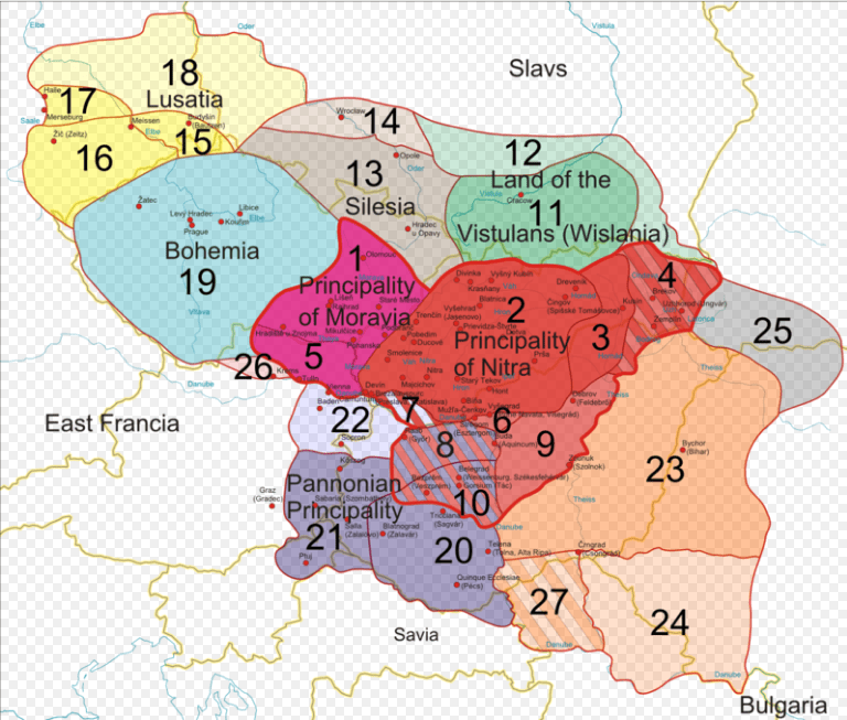 Uopšteno se veruje da je plemenska zajednica obuhvatala regione Moravsku, Nitraviju (Nitra), Šleziju, Češku i Lužicu. Prema Julijusu Bartlu, centar države ležao je „negde u oblasti južne Moravske, Donje Austrije i zapadne Slovačke (Nitravije)“.