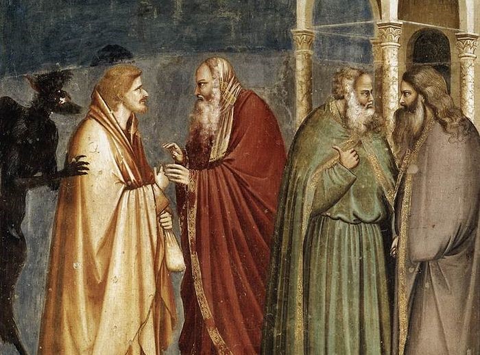 Када је Исус био у Витанији, у кући Симона губавог, пришла му је жена са алабастерном посудом скупоценог помада и излила му је на главу док је он лежао. Видевши то, Његови ученици се огорчоше и рекоше: Чему толико расипање? Јер овај мелем се могао скупо продати и дати сиромасима. Али Исус, схвативши то, рече им: Зашто срамотите жену? учинила ми је добро дело: јер сиромаха увек имаш са собом, а Мене немаш увек; изливши ово миро на тело Моје, она Ме припреми за погреб; Заиста вам кажем, где год се ово јеванђеље проповеда по целом свету, оно што је учинила биће испричано у њеном сећању. Тада један од дванаесторице, звани Јуда Искариотски, оде првосвештеницима и рече: Шта ћете ми дати, а ја ћу вам га предати? Принесоше му тридесет сребрника; и од тог времена тражио је прилику да Га изда.