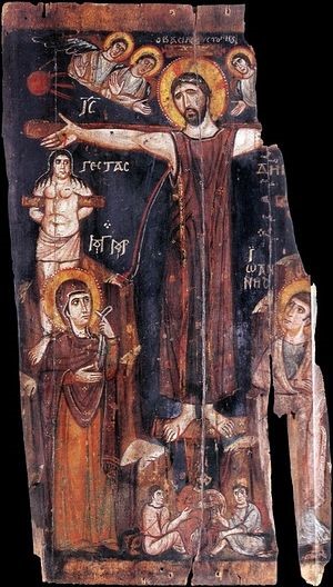 Богочовек на крсту; један од разбојника разапетих са Њим, осуђујући другог за богохулне речи, исповеда Исуса Христа као Господа, и Његову невиност и Божанство. Најзад, у славу Распетога, један за другим следе страшни знаци који најављују искупљујуће страдање и смрт Пресветих Светих и опомињу распеће (1. Кор. 2, 8). У Јерусалимском храму завеса је поцепана на два дела, показујући да је смрћу васељенске Жртве на крсту дошао крај древне скиније и свима се отворио пут до саме светиње (Јевр. 9,8). ).