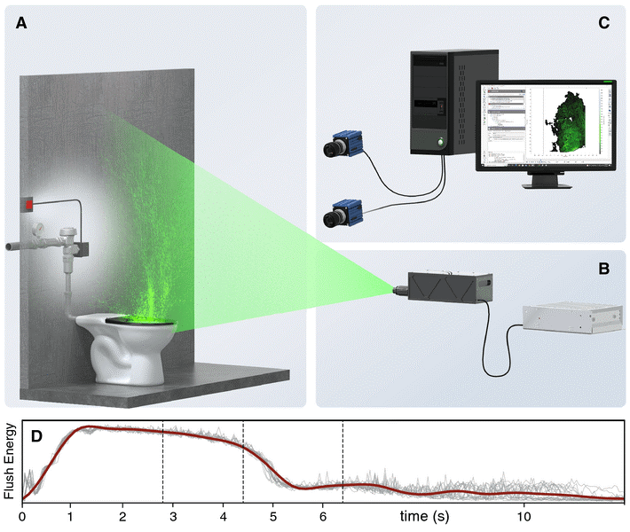Da bi svojim očima videli mlaznice, u novoj studiji, tim je u laboratoriju ugradio toalet sa ventilom za ispiranje, poput fluksometra, koji koristi pritisak da gura vodu u želјenom pravcu. Specijalna optika i moćni laseri pomogli su da se stvori tanak vertikalni sloj zračenja koji je osvetlјavao čitav prostor od posude do plafona.
