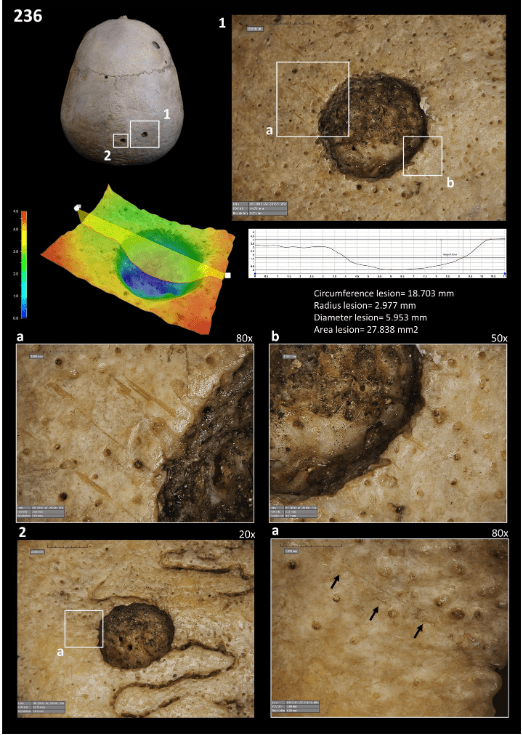 Mikroskopsko posmatranje je sprovedeno korišćenjem HIROX digitalnog mikroskopa HR-2016. Mikroskop je predstavljao napredak u karakterizaciji osteoblastičnih i osteolitičkih lezija za tačnu dijagnozu. Pored toga, mikroskop je pomogao u razlikovanju tafonomskih i patoloških oštećenja i omogućio precizno merenje svih vidljivih lezija na lobanjama. U tom smislu, evaluacija mikroskopskih rezultata (zajedno sa patološkom analizom) oblikovala je preliminarni opis koštanih promena i diferencijalnu dijagnozu pretrpljenih stanja.