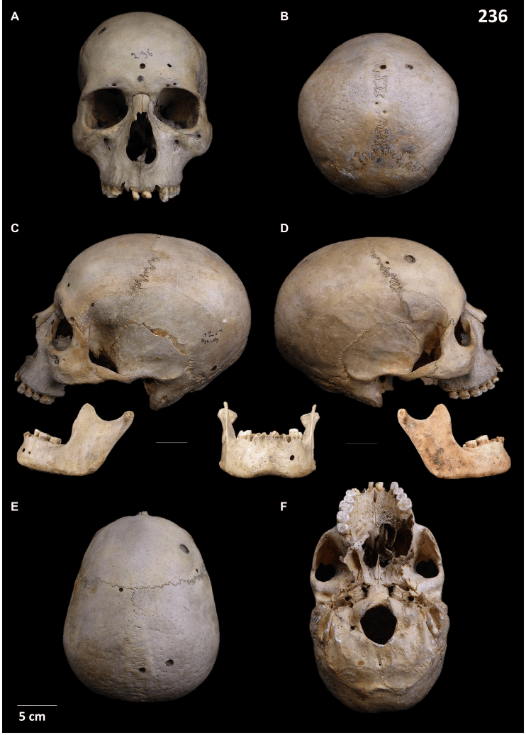 Antropološka analiza procenila je da lobanja pod oznakom E270 pripada odrasloj ženskoj individui sa biološkom starošću skeleta starijoj od 50 godina, dok je lobanja pod oznakom 236 pripadala odraslom muškarcu od 30 do 35 godina skeleta. Obe pokazuju patološke lezije opisane u nastavku.