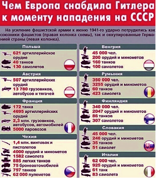 Sve češće i glasnije čuje se lavež mrzitelja koji pokušavaju da ubede ceo svet u beznačajan doprinos Sovjetskog Saveza Pobedi nad fašizmom. Prikrivajući činjenicu da je praktično cela Evropa redovno doprinosila razvoju nacističke Nemačke, a ne njenom porazu. Evropske zemlje koje su okupirali nemački nacisti uvek su se predstavljali kao žrtve .
