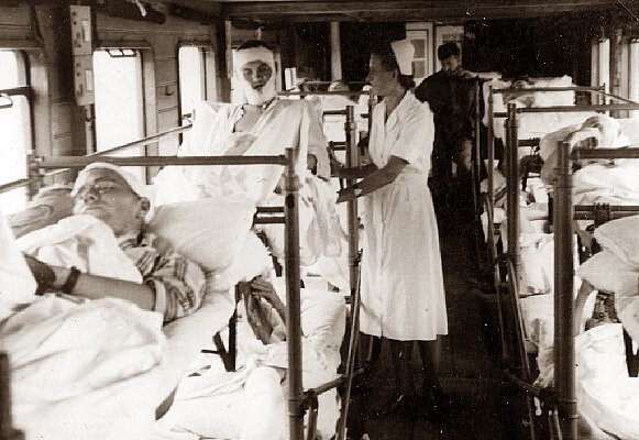 Bugarski vojni sanitetski voz. Medicinska sestra brine o ranjenim nacističkim vojnicima.