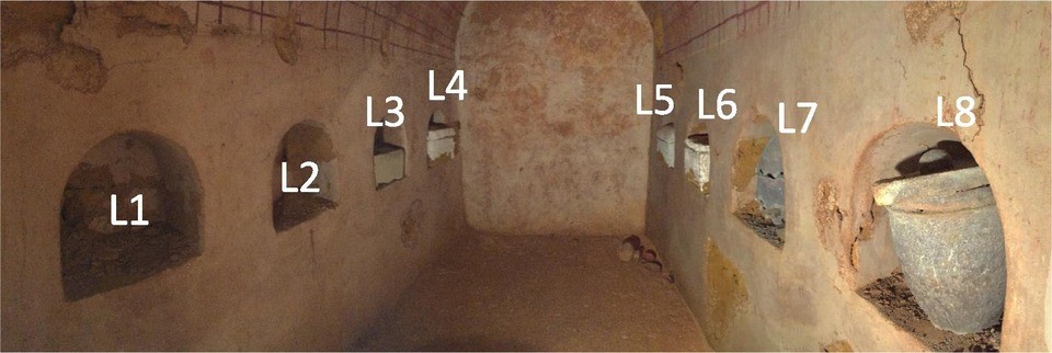 Arheolozi su 2019. pronašli jedan takav ulaz u podzemnu grobnicu koja je verovatno bila grobnica bogate porodice. Jednom u unutrašnjoj komori dimenzija 3,29 × 1,73 metara i sa maksimalnom visinom svoda od 2,41 metar, otkrili su osam lokula (niša) u zidovima za pogrebne urne, od kojih su dve bile prazne. U svim ostalim lokulama nalazila se urna, od kojih je jedna bila od krečnjaka, tri od peščara, a još dve od stakla, pri čemu su druge bile u posudama za olovne urne.