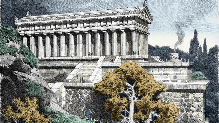Konačno, 435. godine p.n.e. u Hram je postavljena statua Zevsa i ljudi su dolazili da je vide. Ono što im se pojavilo pred očima izgledalo je nemoguće. Visina statue od zlata (upotrebljeno je 200 kg metala), slonovače i drveta bila je oko 13 metara.