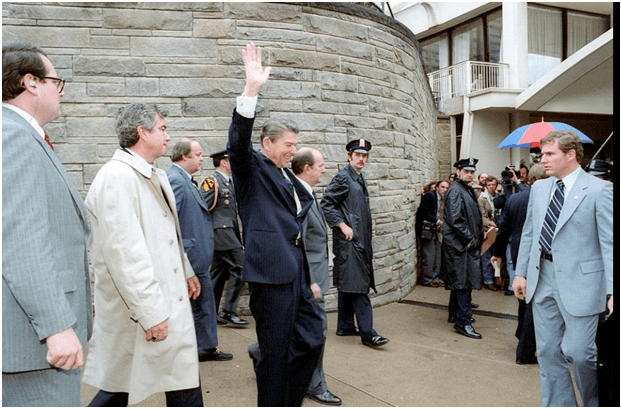 30. marta 1981, dok se Ronald Regan vraćao u svoju limuzinu nakon govora u hotelu Vašington Hilton, potencijalni ubica Džon Hinkli mlađi ispalio je šest hitaca prema njemu, pogodivši ga. Regan je teško ranjen metkom koji je rikošetirao o bok predsedničke limuzine i pogodio ga u levi pazuh, slomio rebro, probušio pluća i izazvao ozbiljno unutrašnje krvarenje. Iako je “blizu smrti” po dolasku u Univerzitetsku bolnicu Džordž Vašington, Regan je stabilizovan u hitnoj pomoći, a zatim je podvrgnut hitnoj eksploratornoj operaciji. Oporavio se i pušten je iz bolnice 11. aprila. Pored Regana, ranjeni su i sekretar za štampu Bele kuće Džejms Brejdi, agent Tajne službe Tim Makarti i policajac Tomas Delahanti. Sva trojica su preživela, ali je Brejdi pretrpeo oštećenje mozga i trajno je onesposobljen; Brejdijeva smrt 2014. smatrana je ubistvom jer je na kraju prouzrokovana ovom povredom.