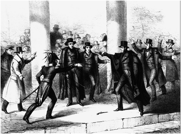 30. januar 1835: Neposredno ispred zgrade Kapitola, moler po imenu Ričard Lorens pokušao je da upuca predsednika Endrjua Džeksona sa dva pištolja, od kojih su oba promašila. Kasnije je neko probao dva pištolja i oba su dobro radila. Lorens je uhapšen nakon što ga je Džekson žestoko pretukao štapom. Lorens je proglašen nevinim zbog ludila i zatvoren je u mentalnu ustanovu do svoje smrti 1861.god.