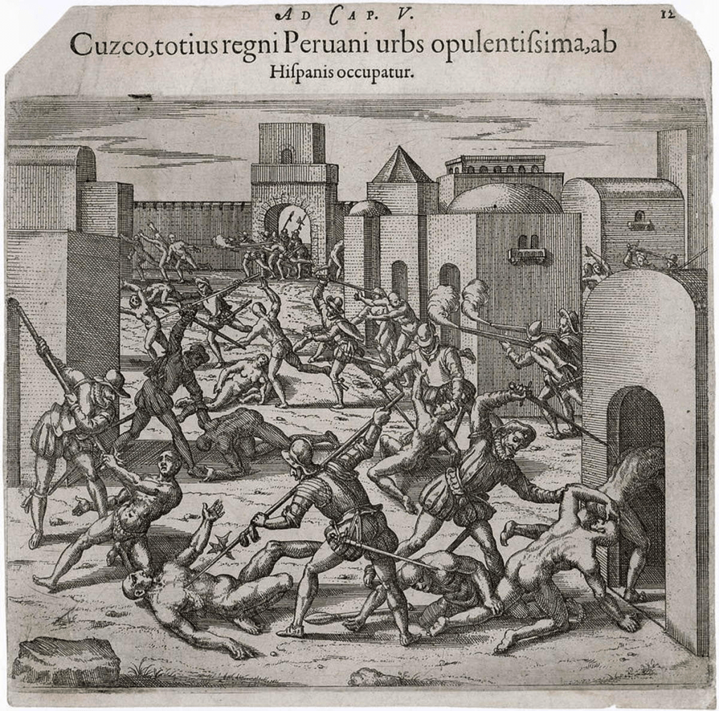 Susret između Atahualpinog dvora i Pizarovih konkvistadora bio je miran sve dok Atahualpa nije odbio ponudu Španaca o prihvatanju katoličanstva. Tada je Pizaro krenuo u napad, zaklavši oko 7.000 Inka i kidnapovajući Atahualpu, a da nije izgubio nijednog čoveka. U roku od godinu dana, Španci su osvojili glavni grad Carstva Inka Kusko, pogubili Atahualpu i zamenili ga marionetskim carem Mankom Inka Jupankijem. Međutim, mladi car je pobegao 1536. godine i predvodio gerilsku pobunu protiv španske vlasti.