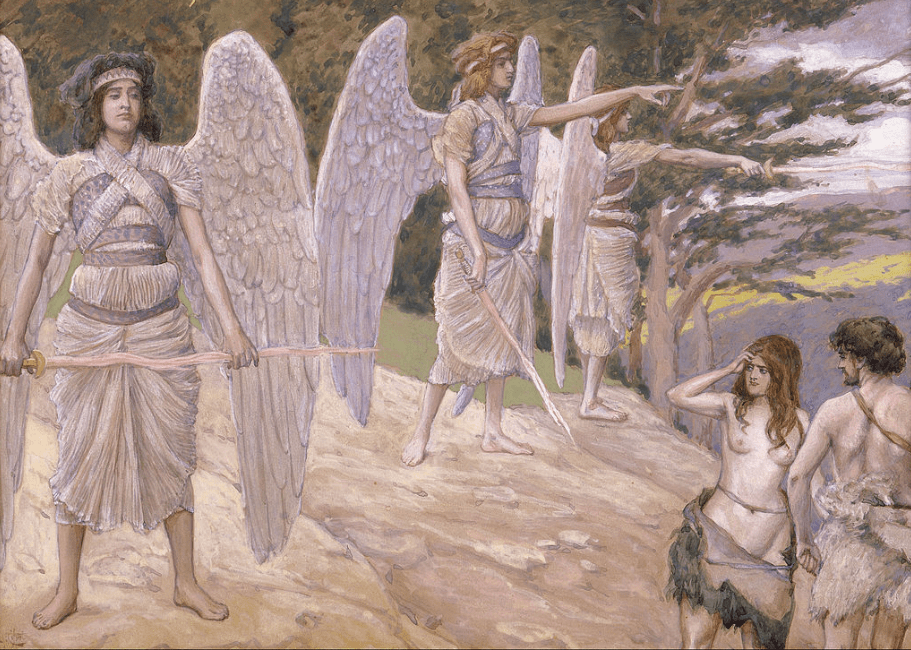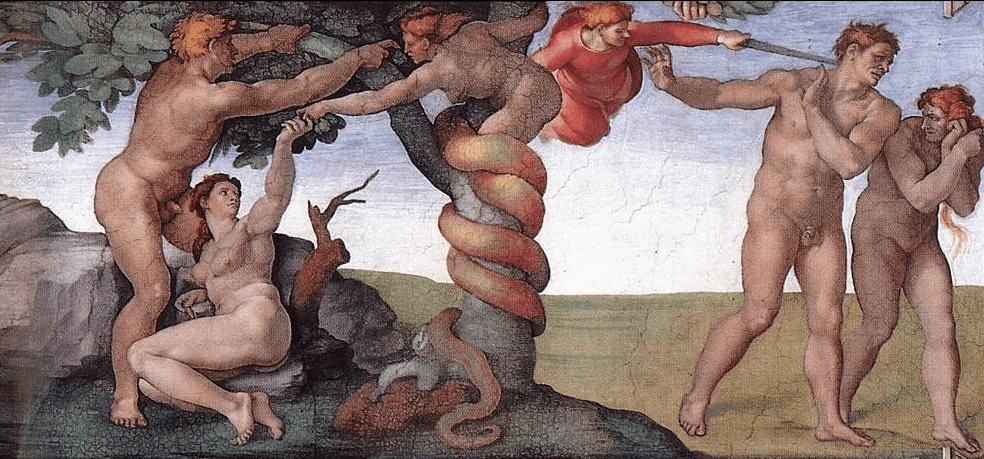 U biblijskoj priči o Adamu i Evi, Bog stavlјa svoje lјudske tvorevine u Rajski vrt i kaže im da mogu slobodno da jedu sa svakog drveta u vrtu osim sa drveta znanja dobra i zla, „jer kada jedete sa njega sigurno ćete umreti“, upozorava Bog. Zatim dolazi zmija, lukavija od drugih životinja i jedina koja, izgleda, ume da govori, i pita Evu šta je Bog rekao o drvetu poznanja dobra i zla. Kada ponovi zabranu da se jede njen plod, zmija se ruga: „Nećete sigurno umreti… Jer Bog zna da će vam se, kada jedete od nje, otvoriti oči, i bićete kao Bog, znajući dobro i zlo“. Tako je Eva, tražeći mudrost, zagrizla zabranjeno voće i dala malo svom mužu Adamu. Kao što je zmija obećala, oni ne umiru i njihove oči su zaista otvorene za postojanje dobra, zla i sramote (bili su goli!). Ali kao kaznu za kršenje Božije zapovesti, oni bivaju proterani iz Rajskog vrta u naš pali svet bola i truda.