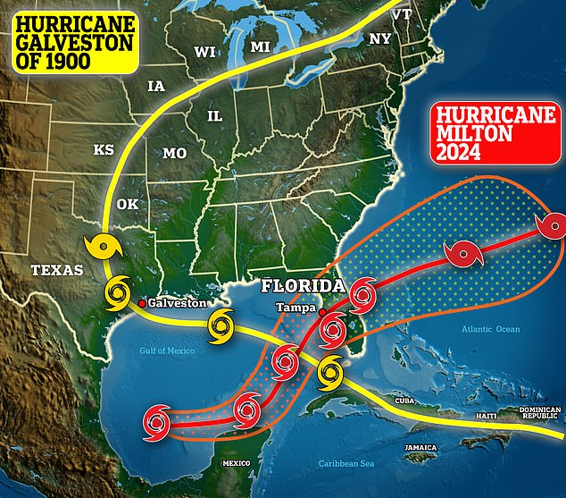 Olujni nalet kategorije 4 preplavio je 1900.god. čitavo ostrvo, uništivši više od 3.600 zgrada, što je ekvivalent otprilike 26 milijardi dolara u današnjem novcu. Prognostičari predviđaju da je Milton – takođe kategorije 4 – doneo rekordni olujni talas u zalivu Tampa i da je materijalna šteta veća – 30 do 50 milijardi dolara.