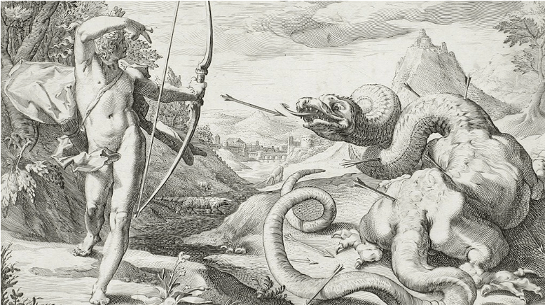 Kasnije u mitu, Apolon je ubio Geu i njenog sina Pitona. Apolon je tada postao bog svetilišta u Delfima. Otprilike 1200. godine pre nove ere, sveta sveštenica je uputila Apolona za sva proročanstva. Veliki Apolonov hram podignut je u sedmom veku pre nove ere i postao je najvažnija građevina na akropolju u Delfima. Izgoreo je 548. pre nove ere, a kasnije je na njegovom mestu podignut novi hram.