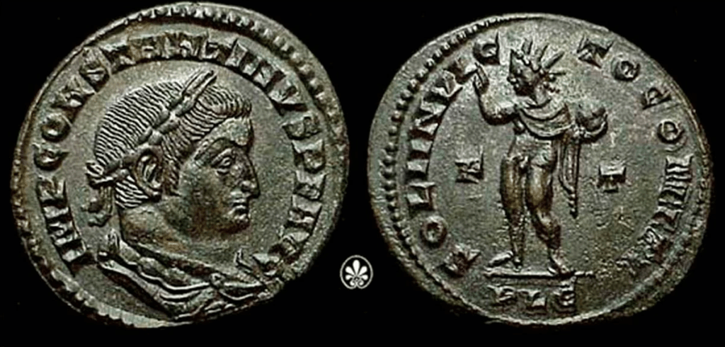 U vreme kada je Konstantin postao car, Sol Invictus je počeo da se prikazuje na kovanom novca širom carstva. Mnogi od ovih novčića sadržavali su fraze koje su tvrdile da je Nepokoreno Sunce bio pratilac cara.