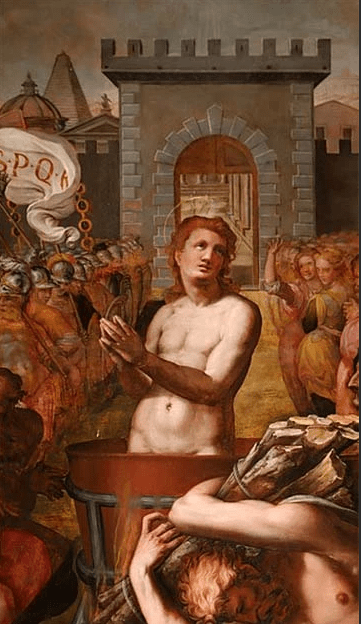 Tertulijan, hrišćanski pisac s kraja drugog i početka trećeg veka, pisao je da su ga, pre nego što su Rimljani proterali, odveli u koloseum i potopili u bačvu sa kipućim uljem. Kada je izašao nepovređen, ceo Koloseum je prešao u hrišćanstvo. Zbog toga neka ikonografija prikazuje Jovana u bačvi sa kipućim uljem.