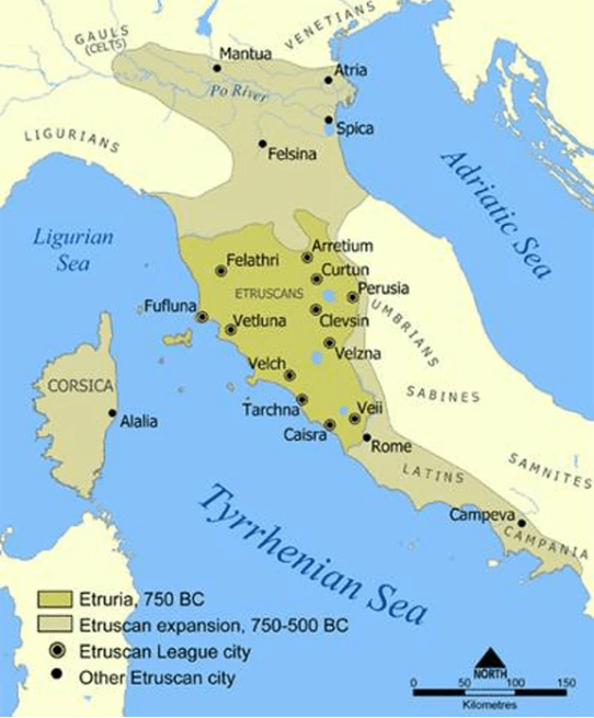 Teritorijalni prostor etrurske civilizacije dostigao je vrhunac otprilike 750. godine pre nove ere, tokom perioda osnivanja Rimskog kraljevstva, pre Republike i kasnije Carstva. Njihova kultura je napredovala u tri gradske konfederacije: Etruriji (Toskana, Lacijum i Umbrija), dolini Po sa istočnim Alpima i Kampaniji.