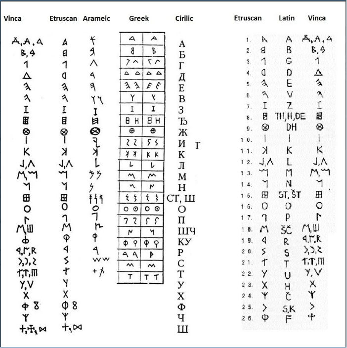 Iako postoji jaz od dve hiljade godina između vinčanskog pisma i kritskog i više između vinčanskog i etrurskog, poređenje koje su uradili neki lingvisti (Harold Harman je jedan od njih) pokazuje visok nivo sličnosti između vinčanskog, kritskog, feničanskog, pa čak i rasnalskog (tzv. „etrurskog“) pisma. Naučnici koji proučavaju drevni protoslovenski jezik uspeli su da prevedu etrurske spise.