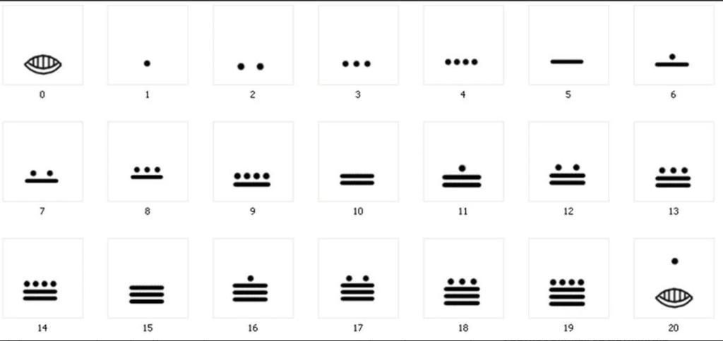 Svaka od horizontalnih linija simbolizuje broj 5, dok tačke predstavljaju 1. Dakle, njihovim sabiranjem dobija se (2 x 5) + (3 x 1) = 13. Dalje, cifra nula u brojevnom sistemu Maja bila je predstavljena sa školjkom, kao što je prikazano u tabeli ispod.