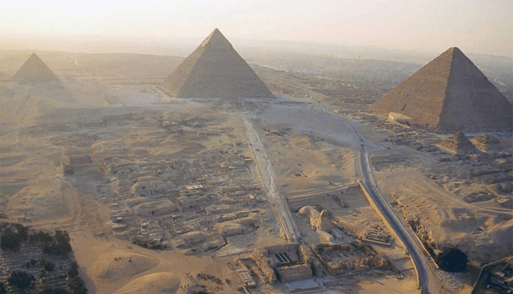 Plato Giza, sa svojim veličanstvenim piramidama koje dominiraju horizontom, bio je vrhunac ovih ranijih ideja. Varijacije, kao što su takozvana ‘Bent’ piramida u Dahšuru, piramida u Meidumu, i nešto kasniji ‘Hramovi Sunca’ u Abusiru, verovatno pokazuju dalje eksperimentisanje, ali tri ikonske piramide kraljeva Kufua, Hafrea i Menkaurea su najupečatljivije i dobro očuvane manifestacije moći religioznog kralja Egipta, koje su dobro očuvane, i to kao trajno nasleđe koje traje za sva vremena. Velika Sfinga je stražarila pred piramidama od cca. 2550. godine pre nove ere, i sam simbol dvojne prirode kralja — smrtnog i besmrtnog, sa mudrošću njegovog božanstva i nepobedivosti njegovog zemaljskog oblika.