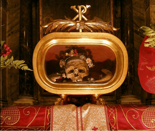 Navodna lobanja svetog Valentina krunisana cvećem izložena je u bazilici Santa Maria in Kosmedin u Rimu.