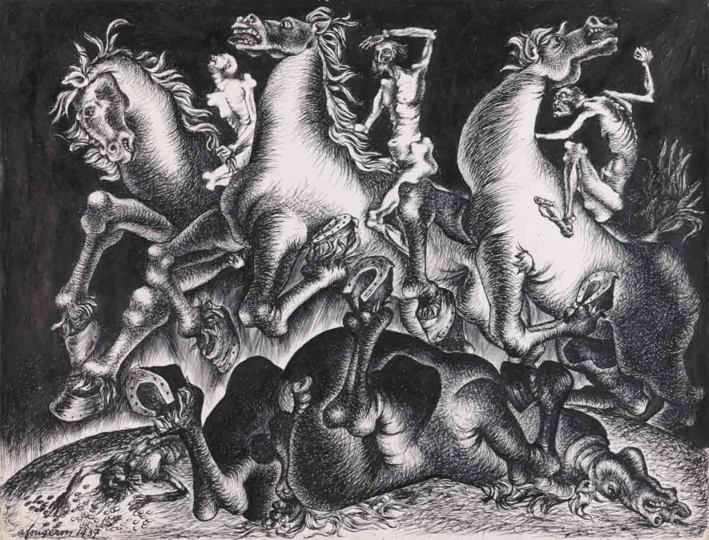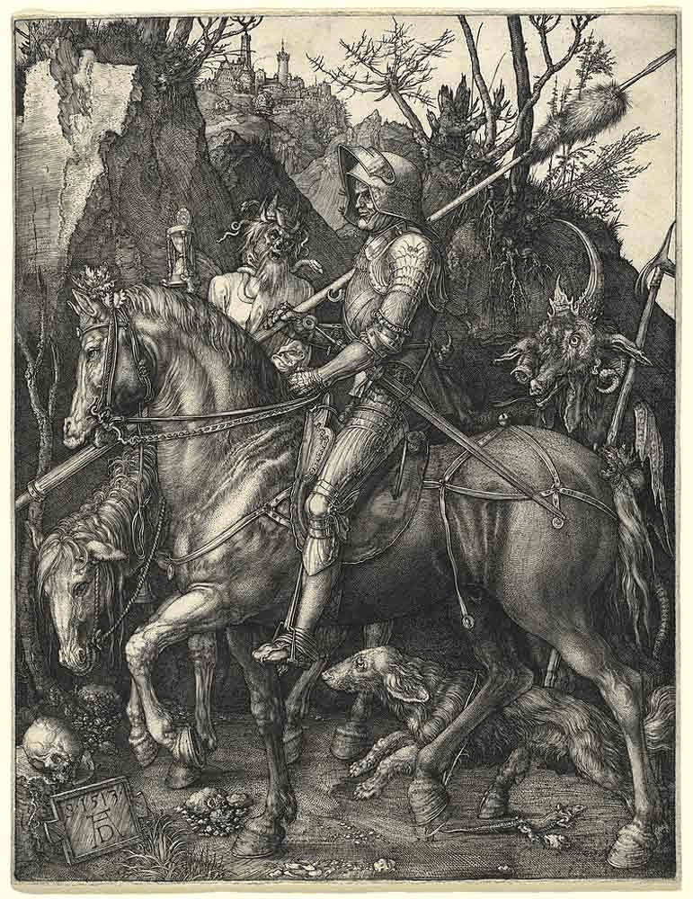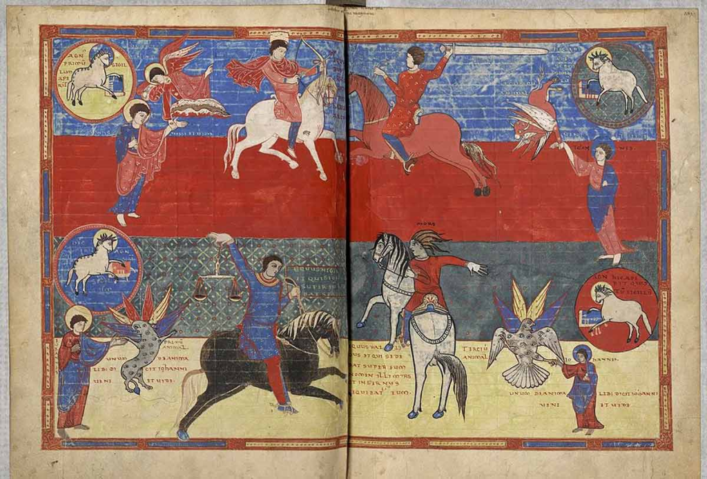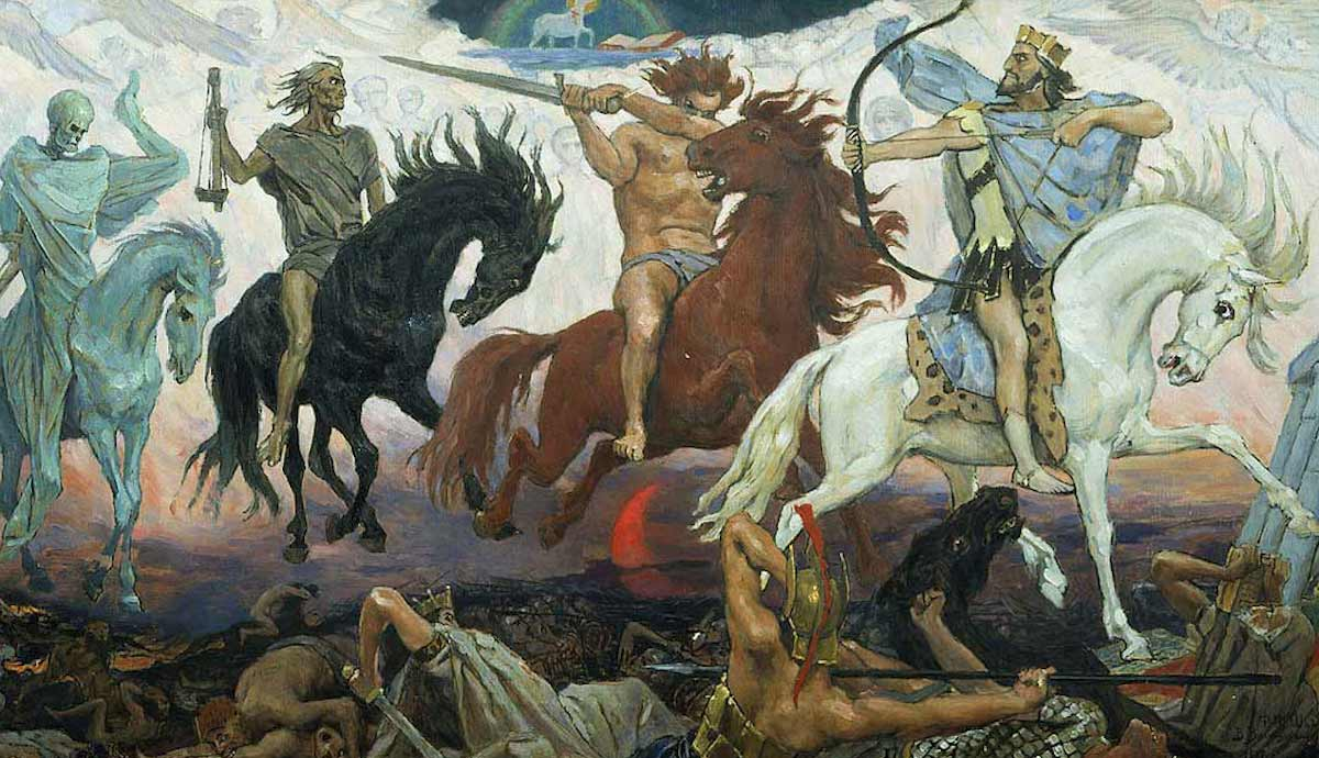 Prvi konjanik nosi luk. Biblijski narativ ga povezuje sa osvajanjem i pobedama. Neki vide ovog jahača na belom konju kao kugu, a ne kao osvajanje. Drugi jahač deluje ratoborno i jaše crvenog konja. Crni konj nosi jahača sa vagom u rukama. On donosi glad i oskudicu. Poslednji jahač je Smrt na bledom konju.