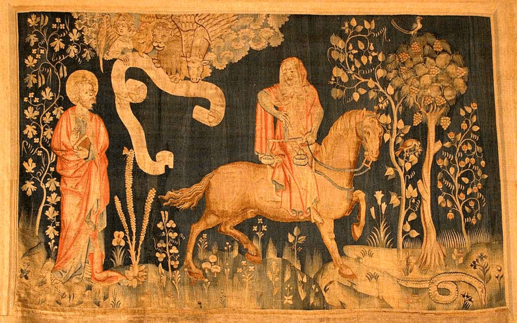 Treći konjanik predstavlja oskudicu Hristove svetlosti i prikazuje ga kao „hleb života“. To ukazuje na nedostatak objavljivanja jevanđelja. Istoričari ovog konja često povezuju sa institucionalizacijom Crkve. Za to vreme mnoga paganska načela, rituali i učenja infiltrirali su se u Crkvu. Ovaj konjanik prikazuje vreme Konstantina i posle.
