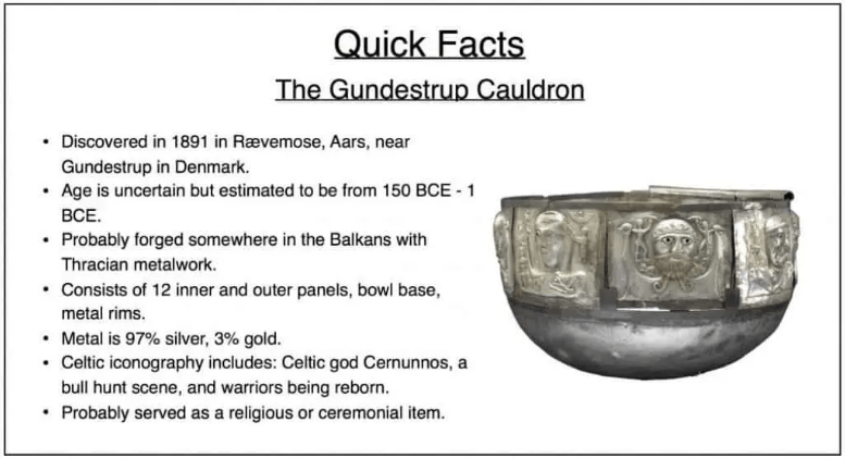Pre oko 2000 godina, neko u Revemozu blizu Gundestrupa, u Danskoj, pažljivo je zakopao gomilu srebrnih ploča uvučenih u polukružni srebrno lonac. Svaka od ploča otkrivala je izvrsne scene keltske mitologije i religije, koje su se sastojale od životinja, heroja i bogova, i bile su vrhunski primeri visoko izrađenog metala. 28. maja 1891. godine, sakupljač treseta koji je radio u močvarama iskopao je srebrne ploče. Arheolozi su proučavali komade i shvatili da kada se potpuno sastave sa činijom, formiraju veliku posudu. Ovo istorijsko i misteriozno blago je lonac iz Gundestrupa.