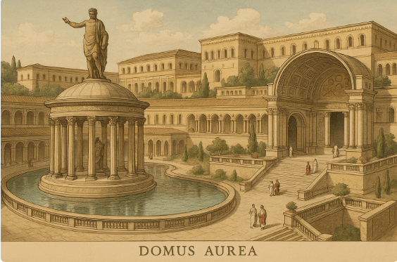 Nakon velikog požara u Rimu 64. godine, car Neron nije sagradio novu, skromnu prestonicu – već je iskoristio ruševine da podigne svoju fantastičnu “Zlatnu kuću”, poznatu kao Domus Aurea. Bila je to ekstravagantna palata kakvu Rim nikada nije video: stotine prostorija, vrtovi, veštačka jezera, sobe sa zlatnim svodovima, čak i rotirajuća trpezarija.