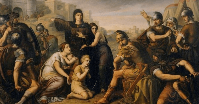 „Koriolan je bio duboko dirnut; gotovo van sebe, trgnuo se sa svog mesta i, trčeći ka majci, zagrlio bi je da ga nije zaustavio njen iznenadni bes… Njegova žena i deca su ga obuhvatili; ostale žene su sve briznule u plač od bola za sobom i svojom zemljom, dok konačno Koriolan nije mogao više da izdrži. Poljubio je ženu i dva dečaka, poslao ih kući i povukao svoju vojsku“ (Istorija Rima, 2.40).