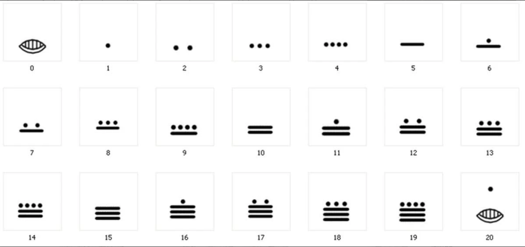 Svaka od horizontalnih crta simbolizuje broj 5, dok tačke predstavljaju 1. Dakle, njihovim sabiranjem dobija se (2 x 5) + (3 x 1) = 13. Dalje, cifra nula u majanskom brojevnom sistemu bila je predstavljena školjkom, kao što je prikazano u tabeli ispod.