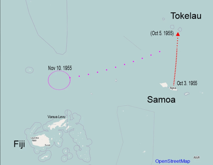 Konačno, skoro pet nedelja kasnije, 10. novembra, trgovački brod Tuvalu, putujući ka atolu Funafuti više od 1.000 km zapadno, ugledao je brod kako pluta usred talasa ispred njih. Brod nije reagovao na pozive sa Tuvalua i kapetan je odlučio da dalje istraži.