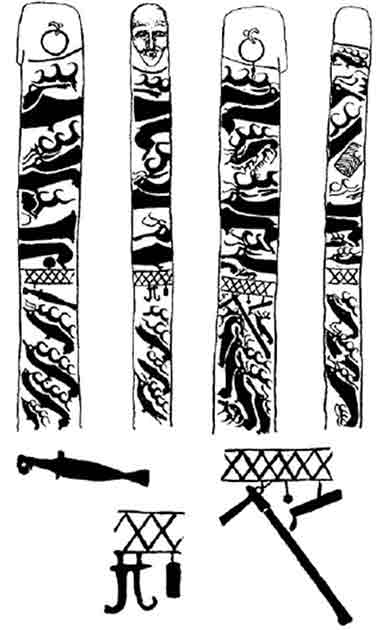 Nisu prikazane samo životinje. Rezbarije uključuju prikaze ratnika, oružja i alata. Čini se da su preferirani određeni oblici ili šare, koji se pojavljuju više puta.