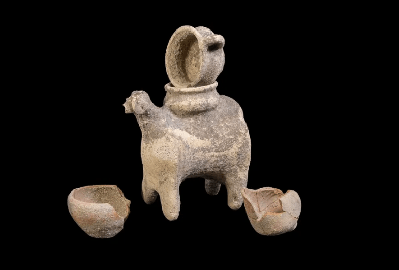 U drugoj jami, istraživači su otkrili nešto što izgleda kao drevni set za čaj, kaže Golani za Harec. Pronađen je glineni lonac u obliku ovna, sa velikom rupom na leđima i izlivom u ustima, zajedno sa setom malih činija. One datiraju iz oko 1275. godine pre nove ere – oko 1.700 godina nakon što je presa za vino isklesana. Posuda u obliku ovna je možda sadržavala „vrednu tečnost kao što je mleko, ulje, vino ili neko drugo piće“, kažu Golani i ko-direktor iskopavanja Barak Cins, arheolog u IAA, u saopštenju. Tečnost je mogla biti „pijena direktno iz izliva, ili sipana u manju posudu za konzumiranje, ili kao zavetni dar“.