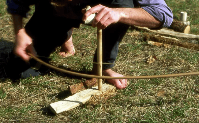 U ovom mehanizmu, žicu na vratilu bušilice pokreće luk koji je vuče napred-nazad, uzrokujući da se alat brzo rotira i prodire u materijal.