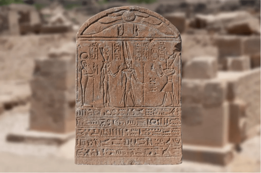 Visokа skoro 60 centimetara, uspravna ploča, poznata kao stela, prikazuje Tiberija kako stoji pored trija egipatskih bogova: Amona, Konsua i Muta. Kako Abdelgafar Vagdi, kodirektor Francusko-egipatskog centra za proučavanje hramova Karnaka, kaže za Margeritu Basi iz časopisa „Live Science “, scena je verovatno trebalo da prikaže cara koji održava „maat“, ili kosmički poredak, interеagujući sa lokalnim božanstvima.