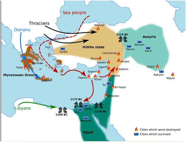 Drevni egipatski zapisi opisuju misteriozne osvajače poznate kao „Morski narodi“. Ove grupe su napadale priobalne gradove i ometale trgovačke mreže. Njihov tačan identitet ostaje neizvestan, ali se veruje da su bili kombinacija raseljenog stanovništva, osvajača i migracionih grupa.