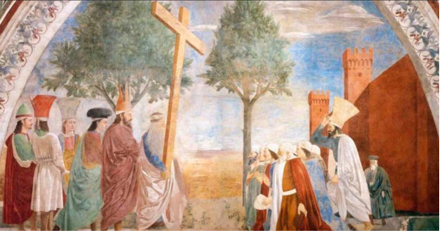 Pjero dela Frančeska, „Vozvišenje krsta“, sa onim što izgleda kao NLO koji posmatra iz oblaka sa desne strane (Pjero dela Frančeska)