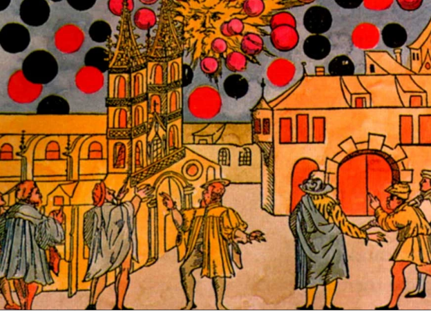 Ovaj duborez, isklesan u Bazelu u Švajcarskoj 1566. godine, prikazuje neki čudan vazdušni događaj. Crne kugle su opisane kako se kreću ogromnom brzinom i zaklanjaju sunce dok prekrivaju nebo (Samuel Coccius)